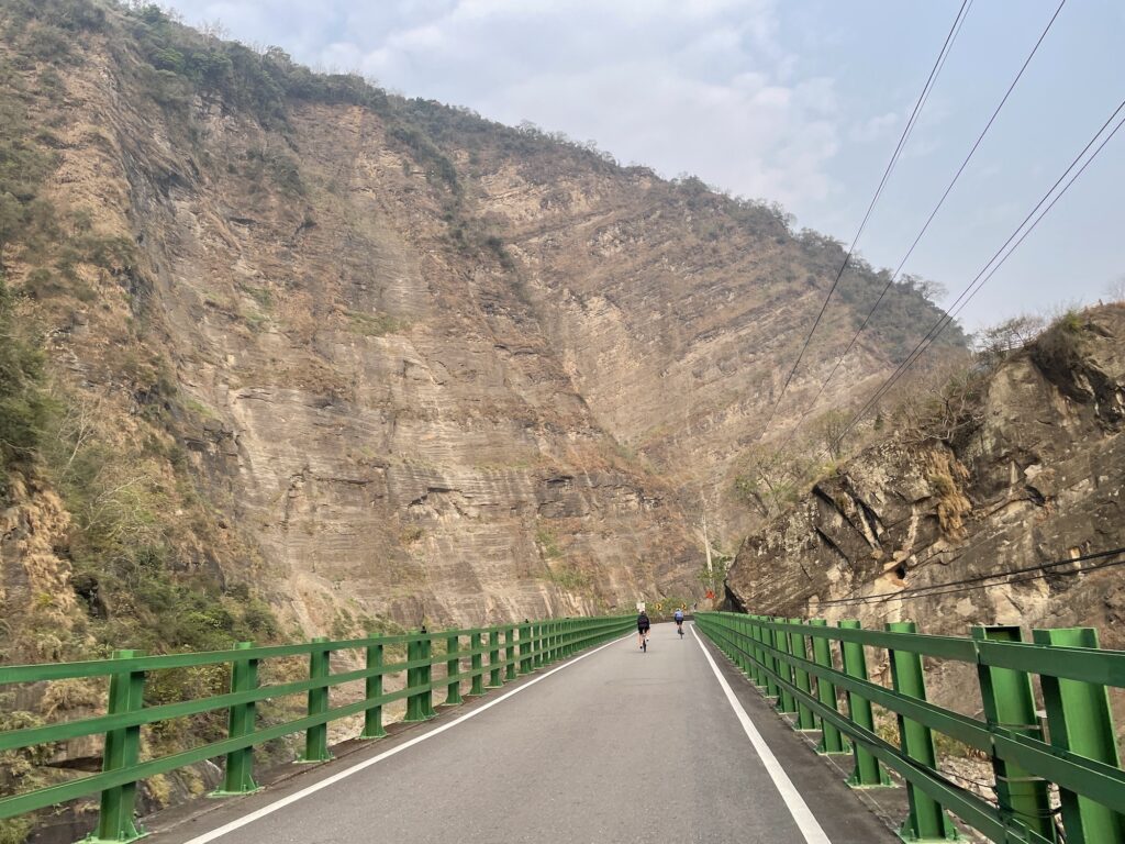 那瑪夏是台29的終點,今日路線是從那瑪夏出發,經甲仙再走台20切過山區抵達六龜。那瑪夏是楠梓仙溪畔的部落,清晨的楠梓仙溪河谷還沒照到太陽,有點起雞皮疙瘩,一路往下到一片開闊的崩壁峽谷處才有陽光,不忍讚歎這崩壁峽谷的美,雖然不如太魯閣錐麓斷崖般壯麗,但是垂直陡峭,僅一些綠色的植被可以稍微攀附,大部分所見都是岩層的黃褐色,層層疊疊。除了綠色的橋身外沒什麼人造物,實在很想停留拍照,可是大家都飆車超快,深怕自己跟不上。只能用雙眼欣賞這片美景,也讓手機留影。