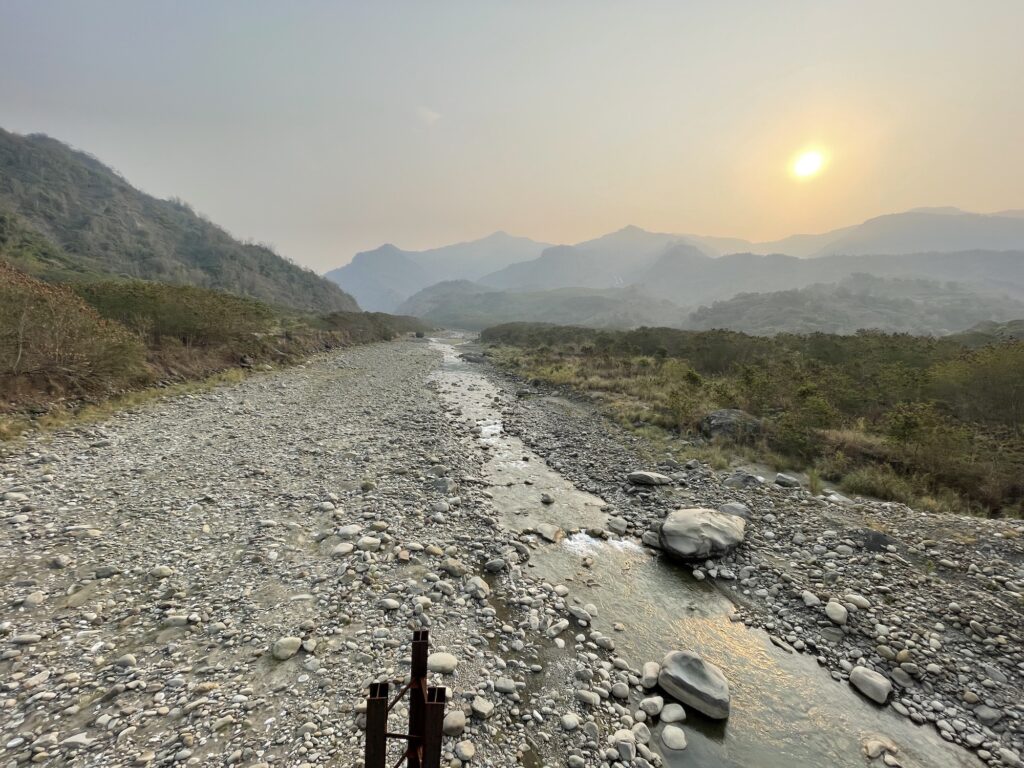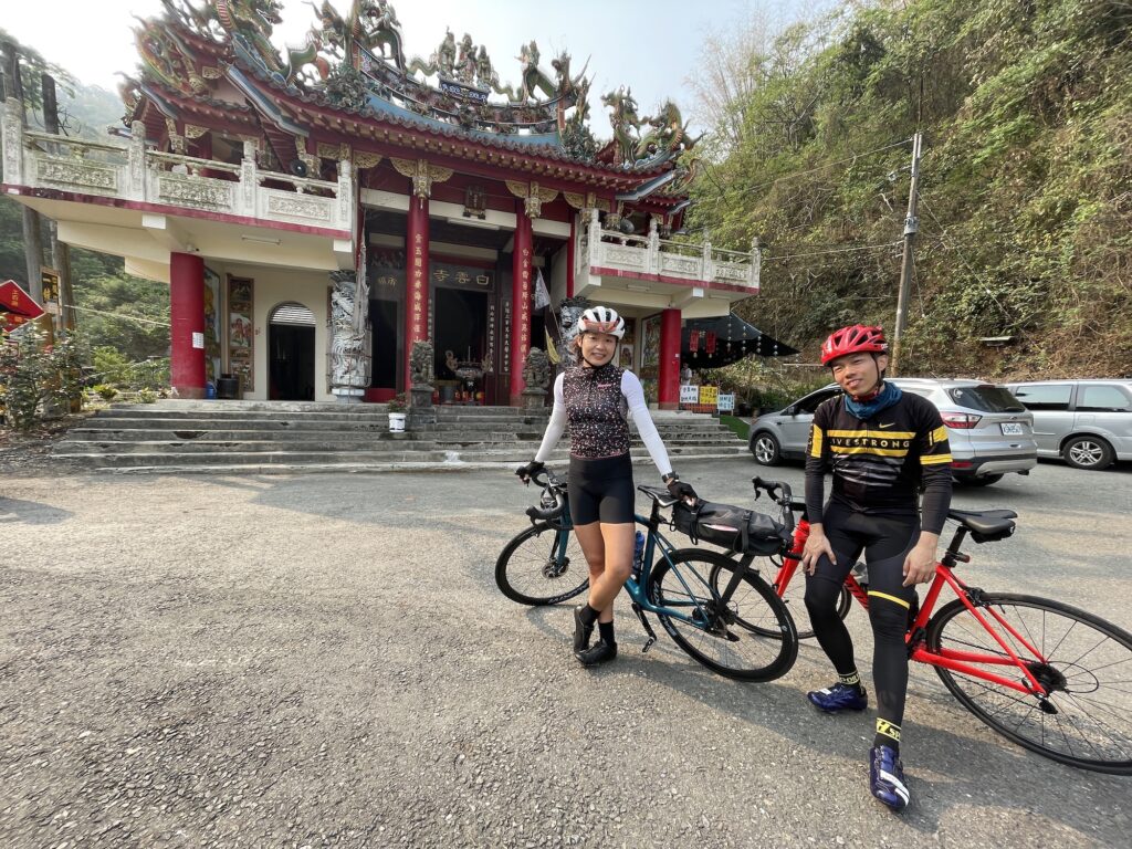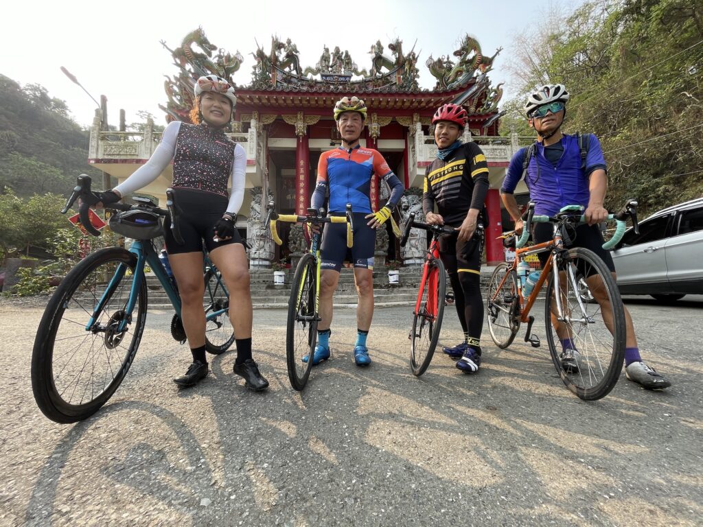 再往下游去再度跨過楠梓仙溪是要進到小林村遺址,這裡有一些回頭彎上坡,可能是水災之後整個地貌改變的結果,同行的人有來過受災前的小林村,感嘆這之間極大的差距。距離2009年的水災也有十多年了,這裡已經完全感覺不出曾經有個將近500人的聚落風華。過了小林村後就是甲仙了,甲仙最有名就是芋頭冰,但是抵達甲仙時候還早,吃冰的胃口還沒打開。所有人也都沒停留,繼續往台20的方向,台20是切穿楠梓仙溪跟荖濃溪的分水嶺的路線,台20的一端是甲仙,另一端就是荖濃溪畔的六龜。分水嶺高點就是本次四日中雙塔爬升的完結,過了這裡之後就再也沒有山路長爬坡。 在坡頂是一間寺廟,團長振祥很貼心的提醒我們這裡是高點,也讓我們停留集結拍照,四日的爬坡終點以茲紀念,接下來就是迎接的就是下滑與旅程尾聲。