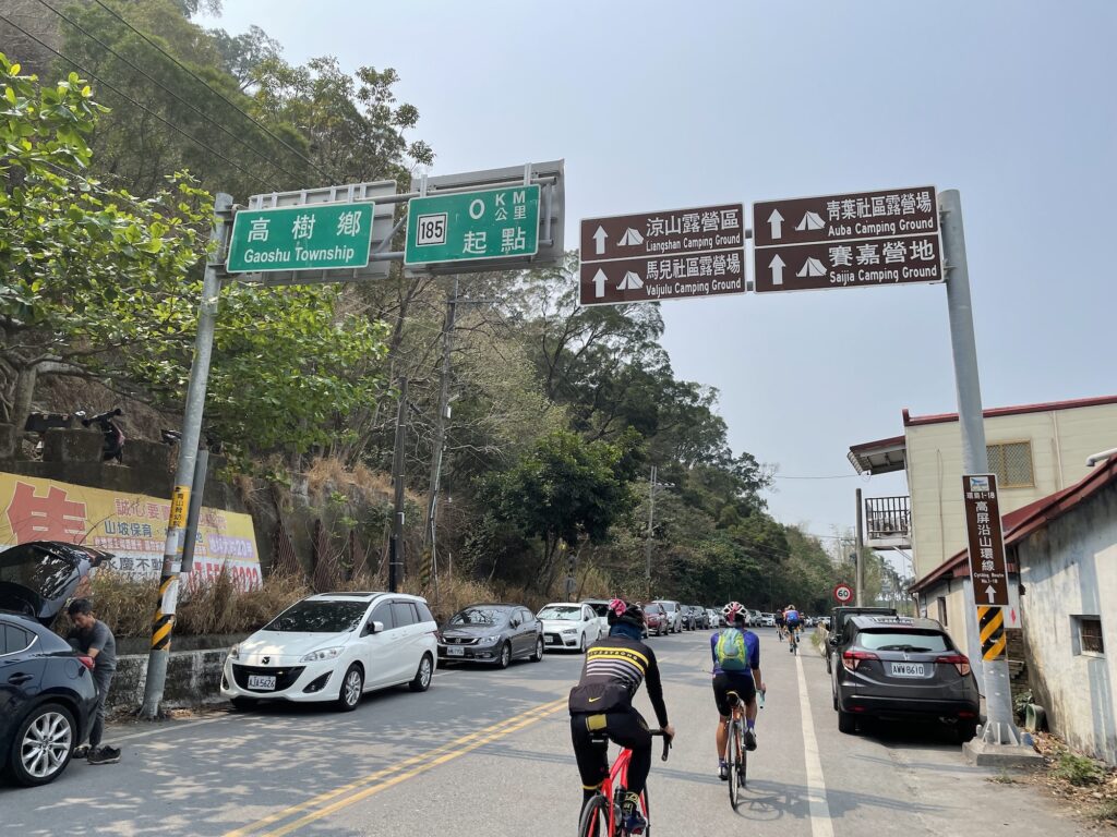 原本規劃的路線是切出荖濃溪後走高樹到潮州,但是當地人林大哥建議我們走185沿山公路,從大津直接接到新埤通枋寮。中雙塔的路線本來就很多版本,但是山路裡能替代的不多,例如:梨山那段走力行產業道路,或嘉義到高雄走關山產業道路。但是進入平地選擇就多了。潮州路線雖然比較近,爬昇少,但市區免不了走走停停與空氣較差,最後大部分人都沒意見,就改走185沿山公路。在10點20分抵達185沿山公路的0K起點處。